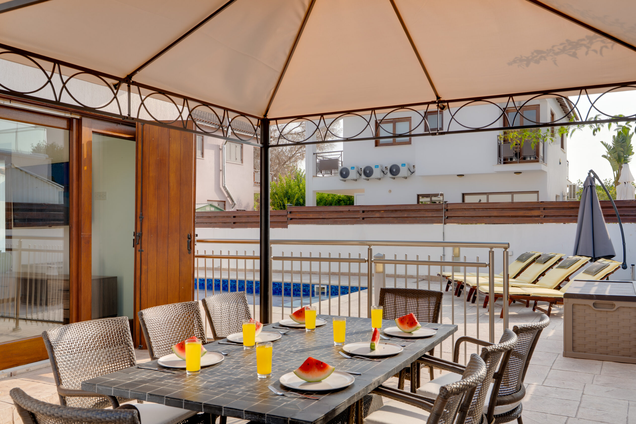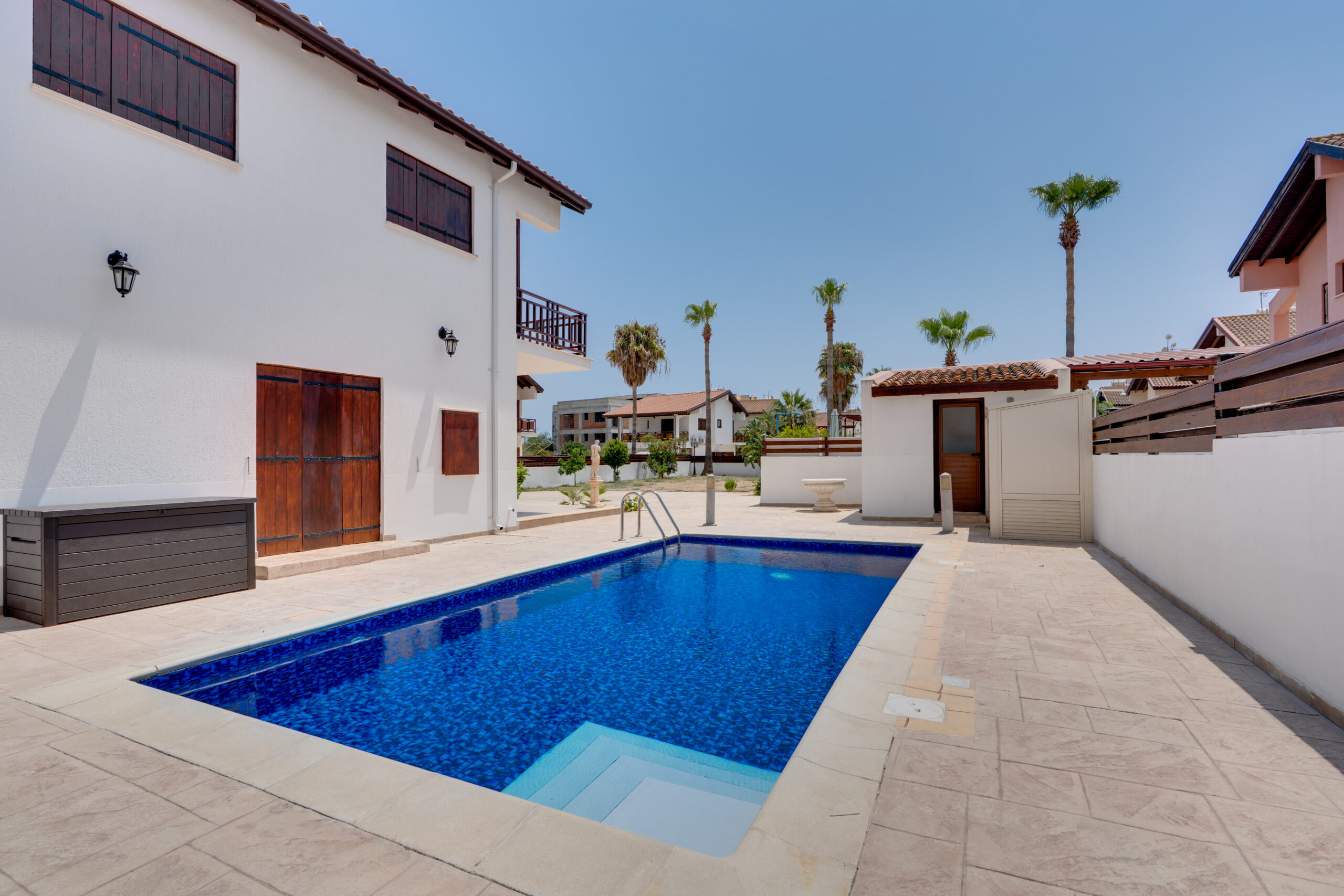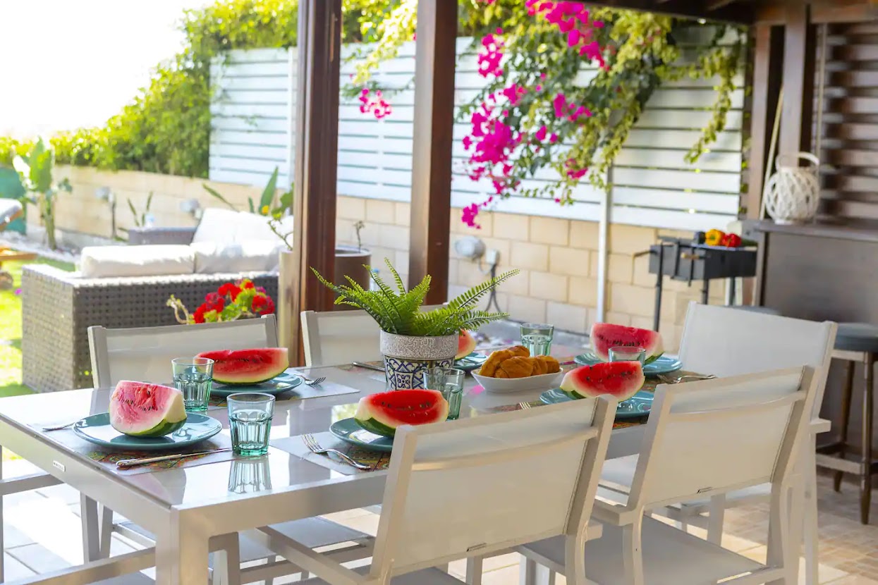 This 3-bedroom villa is perfect for families or groups. It has a private outdoor pool, a fully equipped kitchen, and a comfortable living room. Each bedroom has fresh linens and storage space. The outdoor area includes sun loungers, a dining table, and BBQ facilities—great for relaxing or enjoying meals outside. The villa is located in a quiet area, just a short drive from the beach, shops, and restaurants. Ideal for a peaceful and easy holiday stay.